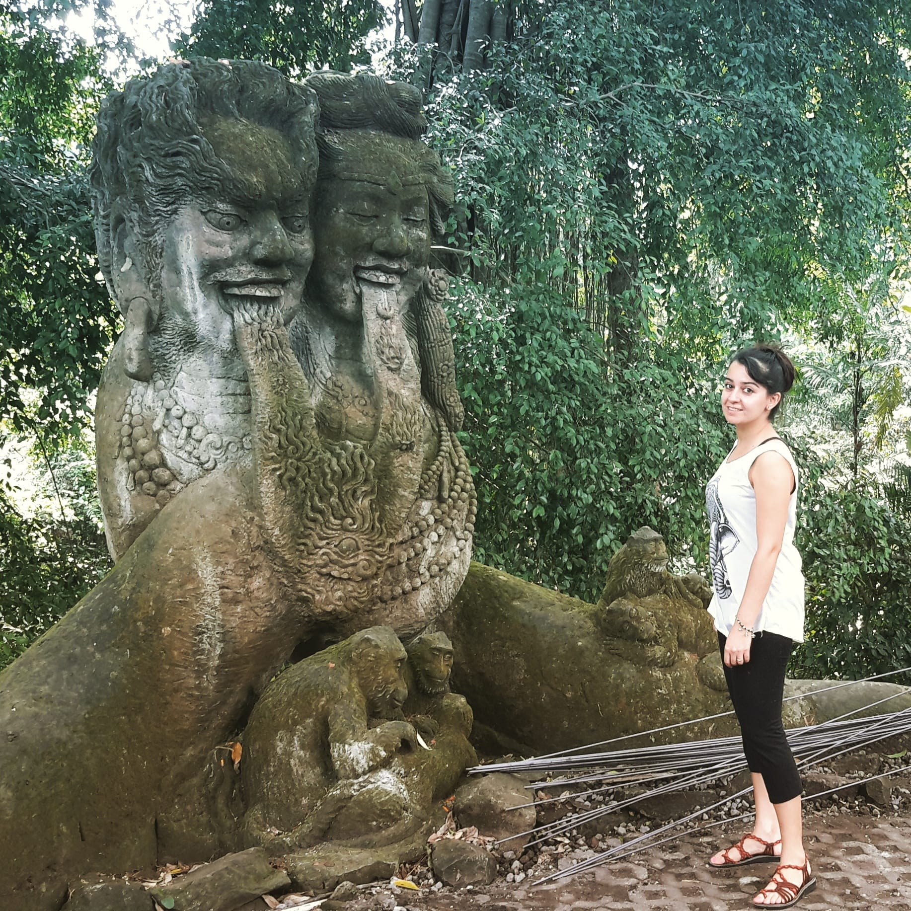The lush green forest, complete with a ravine, creates a “Jurassic Park” ambiance. Statues and temples add to the serene and humbling atmosphere.